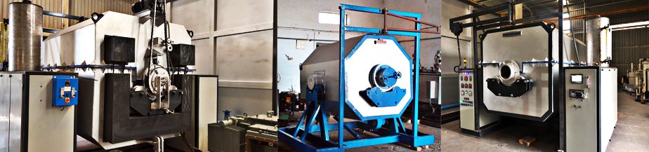 A wide range of electrically heated or gas-fired rotary retort furnaces suitable for processing small parts such as piston pins, ball bearing balls, small bearing races, universal joints, bolts, nuts, sheet metal screws, etc..